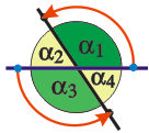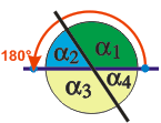 α1 hat α2 (oder α4) Nebenwinkel. Jeder der vier hier abgebildeten Winkel hat zwei Nebenwinkel. |